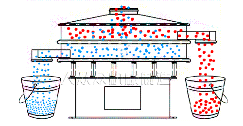 旋振篩采用立式電機(jī)作激振源,工作時(shí)通過(guò)偏心重錘將電機(jī)的旋轉(zhuǎn)運(yùn)動(dòng)轉(zhuǎn)變?yōu)樗?、垂直、傾斜的三次元運(yùn)動(dòng),這個(gè)運(yùn)動(dòng)力傳到篩面,從而使篩面上的物料一起運(yùn)動(dòng),伴隨著篩網(wǎng)的運(yùn)動(dòng),小于篩面孔徑的物料通過(guò)篩孔落到下層,大于篩面孔徑的物料從排料口排出,完成篩分工作??梢酝ㄟ^(guò)調(diào)整偏心塊的位置,來(lái)改變物料的運(yùn)動(dòng)軌跡,從而適應(yīng)不同的篩分目的。