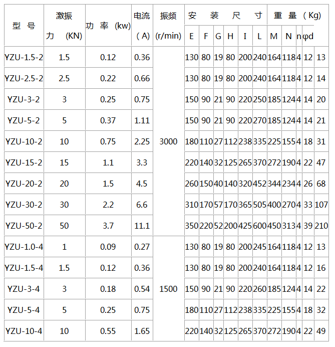 YZU振動電機(jī)技術(shù)參數(shù)